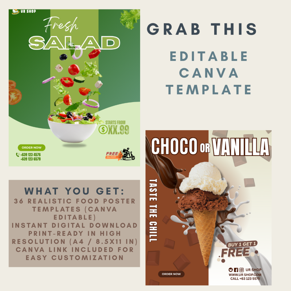 You'll get all 36 editable templates,Including cakes,iceream,pizza,shawarma and many more